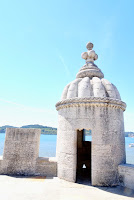 背著紀念碑沿海走去,約10-15分鐘便來到貝倫區最有名氣的地標 - 貝倫塔(Torre de Belem)。注意: 發現者紀念碑和貝倫塔的海邊是不相連的,需轉出大路才能來到貝倫塔。排隊一早已在預算之中,每30分鐘一次入場卻是預料之外的安排。在陽光暴曬下排隊絕不是艾尼的性格... 幸好,發現持有里斯本卡有特快通道入場!雖然還需等那餘下20分鐘的下一場,但已比在橋上排隊購票的人好多了,票價為€6,持有里斯本卡免費入場!其實非常明白30分鐘一場的安排的需要,因為畢竟是一座塔,太多人可能不穩,所以限制每次入場人數是理所當然的事!唯有忍耐一下吧!或買張里斯本卡吧!哈哈!貝倫塔是一座樓高五層用作防守貝倫海岸的碉堡,上下樓梯的空間窄小,闊度只能容納一個人的身軀,所以每層設有紅綠燈顯示可離開樓層的時刻。頂層能飽覽貝倫海的四周,四角都各有「涼亭」可稍作休息。海風吹來,炎炎夏日中帶有涼意很寫意。貝倫塔的基底有炮台,總覺得以前有人在軍事上在此壯烈犧牲。貝倫塔開放時間: 10月至4月: 1000-1730; 5月至10月: 1000-1830貝倫塔網址: http://www.torrebelem.gov.pt/en/