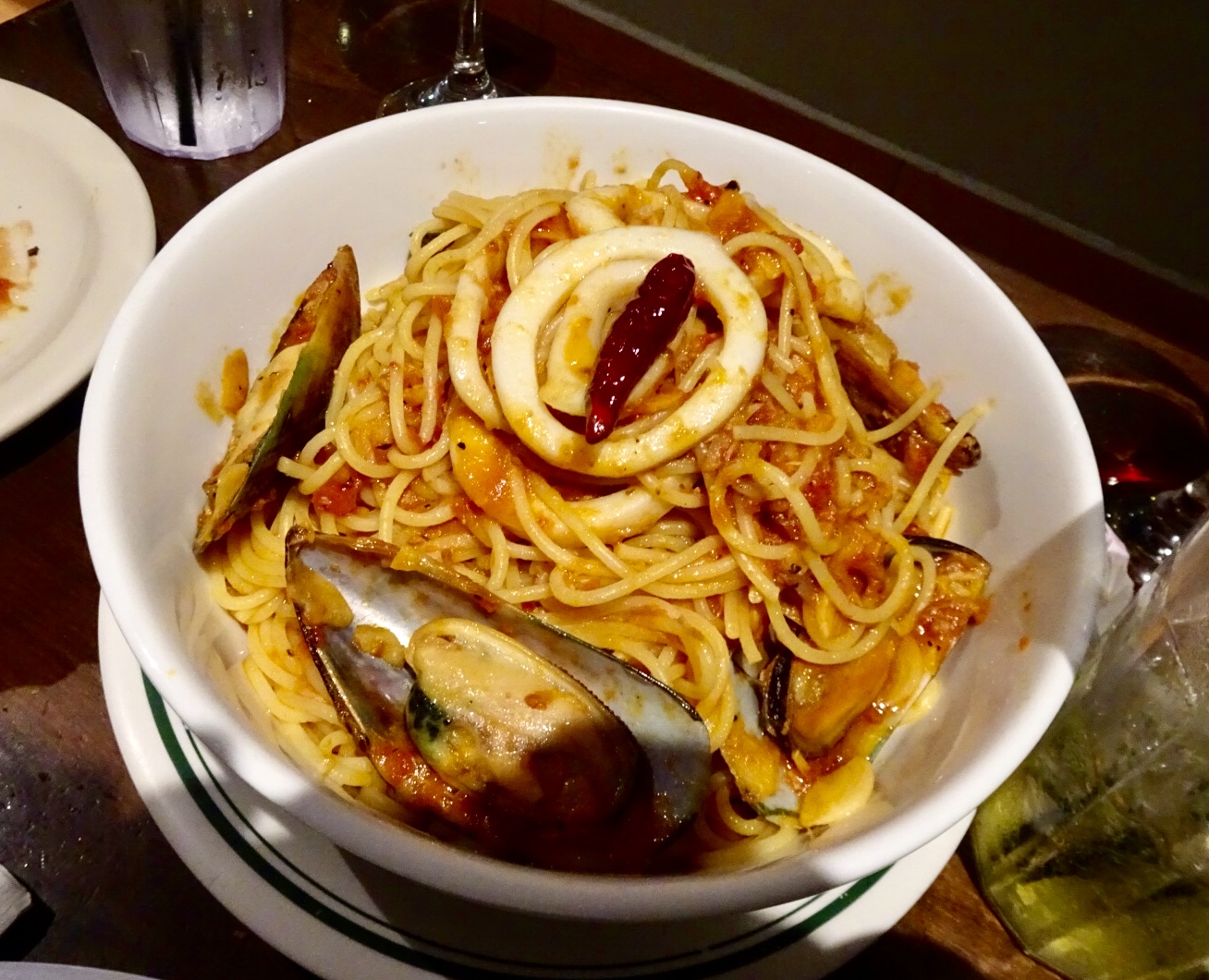 雖然享用過後牙齒和嘴唇都沾上烏黑的墨汁,貌似彊屍,但柔軟的麵條配上甜中帶鹹的醬汁,味道一流,難怪成為招牌菜。卡布尼喬莎的炸魷魚圈同樣出色!記得一試!