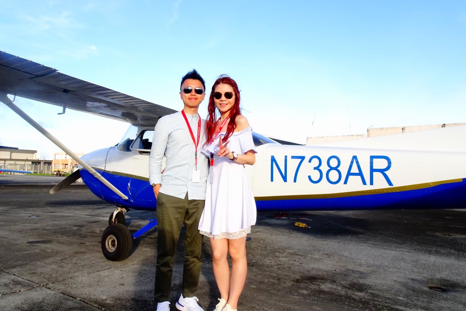 開車,已成為香港的日常「運動」。開飛機,卻一竅不通。正因為好奇心的驅使,尼尼要跟一眾朋友們飛上天了。留意:任何旅遊保險都不包括小型飛機。登機處就在關島機場的附近,所以離開小型飛機的等候室後,便要戴上名牌,方便辨認。先在等候室上一節簡單的課堂,約10-15分鐘,記好起飛時要拉著軚盤、在機上要輕力地轉動軚盤控制左右的移動、和降落時要推著軚盤的動作。準備好後,冒著生命危險,在無保險的情況下登上較常發生事故的小型飛機上,幸好艾艾願意成為尼尼的乘客!其實小型飛機除了教官和駕駛員(尼尼)之外,還可乘載2位乘客。