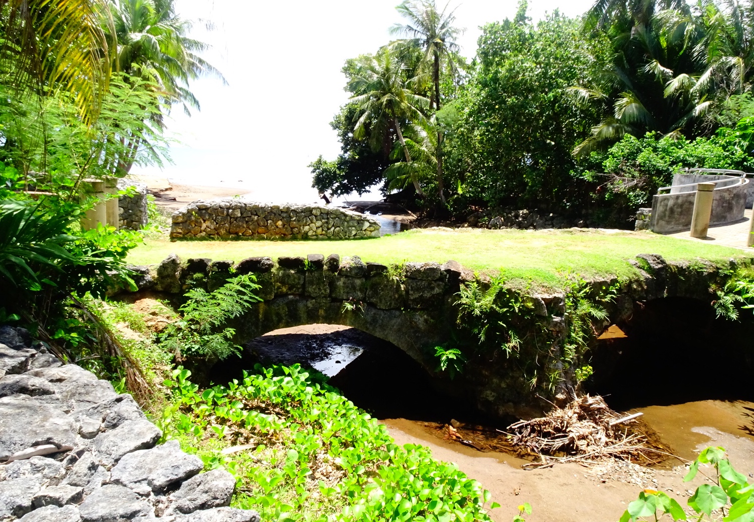離開魚眼公園後,來到阿加特區(Agat)的迷你西班牙古橋(Talaifak Bridge)。迷你的雙拱橋,是西班牙統治時期留下的建築物。正因為它的小,第一次到關島南部時都未能親眼目睹它。橋的一邊有不少芒果掉在地上,原來是附近的一間士多店出售的芒果。對!口渴了或餓了,可到這間南部少見的士多店充飢。但留意,士多店一帶有多隻喜歡吠叫的大小狗,怕狗的您還是盡快上車吧!