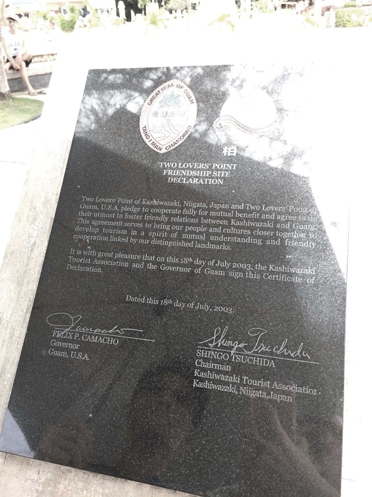 雖然雨下個不停,但仍繼續往附近的悲情景點戀人岬(Two Lovers' Point)出發。相傳有一對情侶因未能得到父母的認同而選擇在此跳崖殉情自盡,所以在園內設有情人匙扣區,讓到來的情侶一同許下願望,祝福愛情。要登上戀人岬展望台需付$3美金,其實在園內已能把懸崖和菲律賓海盡收眼簾,沒有必要花錢吧!門外有一座情人鐘,敲一敲,能改變情運啊!
