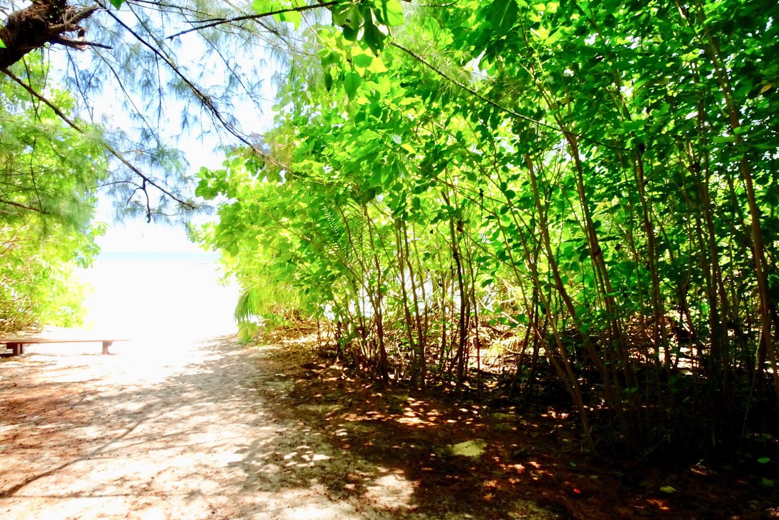 穿過小小的叢林便來到沙灘了。果然,海水在陽光的照耀下顯得更清澈。難怪當時只是早上10時多,沙灘已有泳客了。到關島游泳,除了能在杜夢灣之外,租車的您別忘了這個更寧靜更清澈的瑞提迪恩岬沙灘。