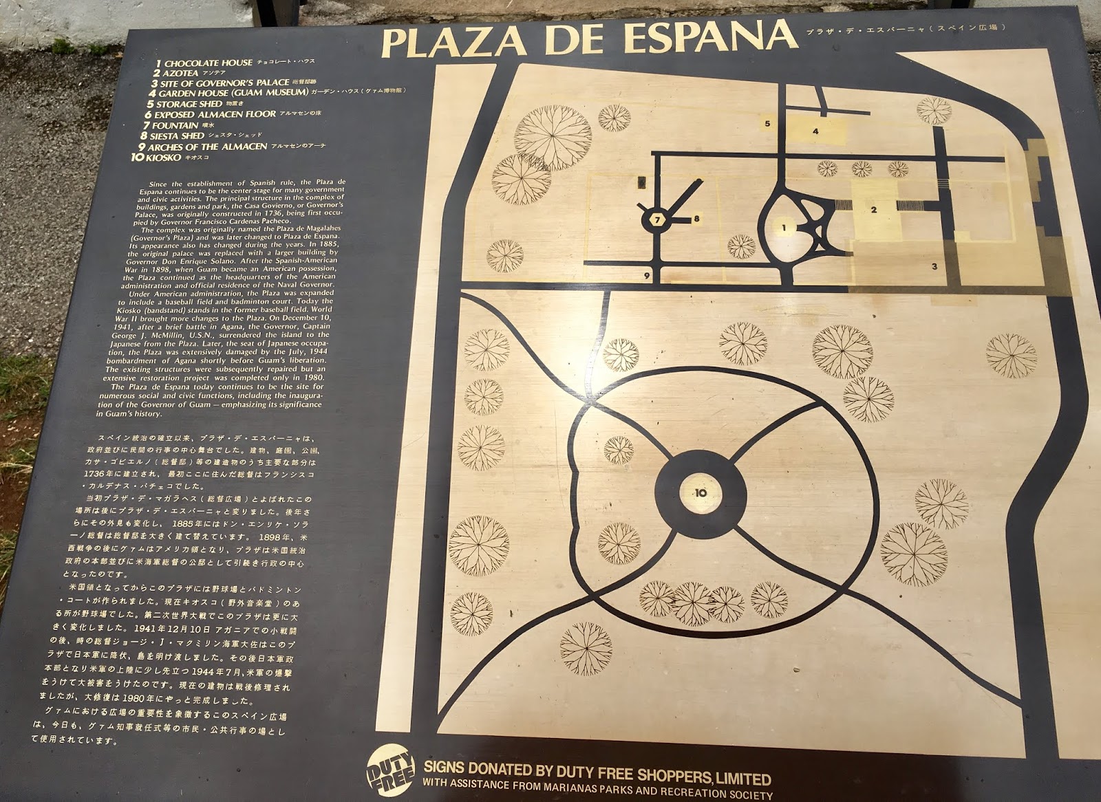 從拉堤石公園開始步行5分鐘便來到西班牙統治時期的總督官邸 - 西班牙廣場(Plaza de Espana)。廣場內種有特別花種的花園、從前用作招待賓客的巧克力屋、涼亭和植物博物館等。門前亦有兩座炮台給遊客拍照留念。跟5年前不同之處是廣場前多了一個GUAM標誌,讓遊客拍照後有一種「到此一遊」的感覺。GUAM標誌背後書一般的建築物是2016年開放的關島博物館(Guam Museum),對關島的歷史有興趣的您,可付$3美金進場參觀啊!