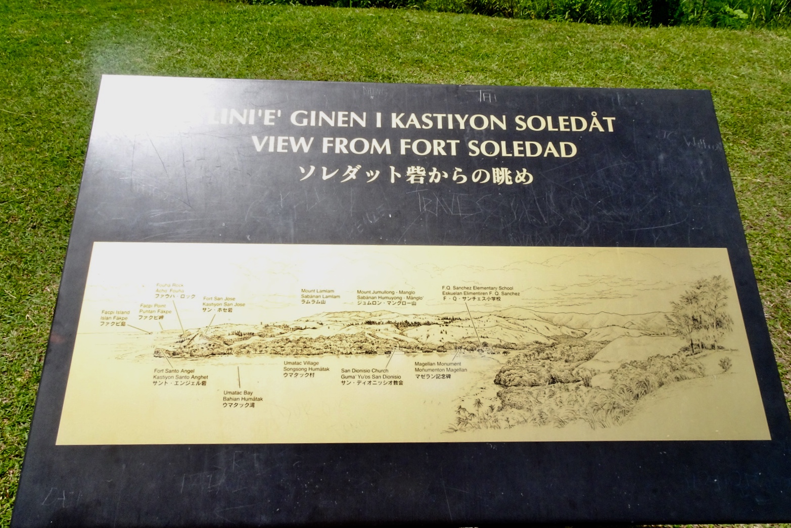 烏美德村被稱為關島最具西班牙建築特色的地方,全因為有一座米白色的San Dioniosio教堂和紅白色的猶馬特克橋(Umatac Bridge)。無可否認,這兩座建築物確實是關島最顯眼的地標,尤其是猶馬特克橋,經過時真的會嘆為觀止。過了猶馬特克橋後便會來到索來戴堡瞭望區(Fort Nuestra Senora De La Soledad)。在公路準備轉入停車處,已看到一頭牛正在散步,原來這一帶都有牛牛出沒啊!在停車迴旋處有一個小攤檔正在賣刺身椰青、芒果和水果乾。炎炎夏日,必然能吸引遊客消費,艾尼一家便是按耐不住的遊客了。