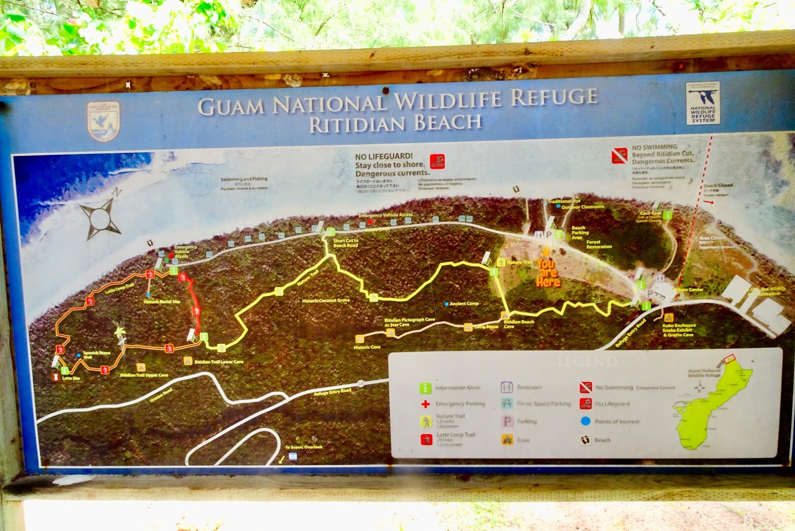 繼續駛往北部被譽為關島最美的瑞提迪恩岬沙灘(Ritidian Point Beach)。一下車,便看到告示牌指示遊客登山路徑。原來瑞提迪恩岬沙灘不但是游泳勝地,更是登山的熱門地。當時也看到不少登山人士正向起點走去。